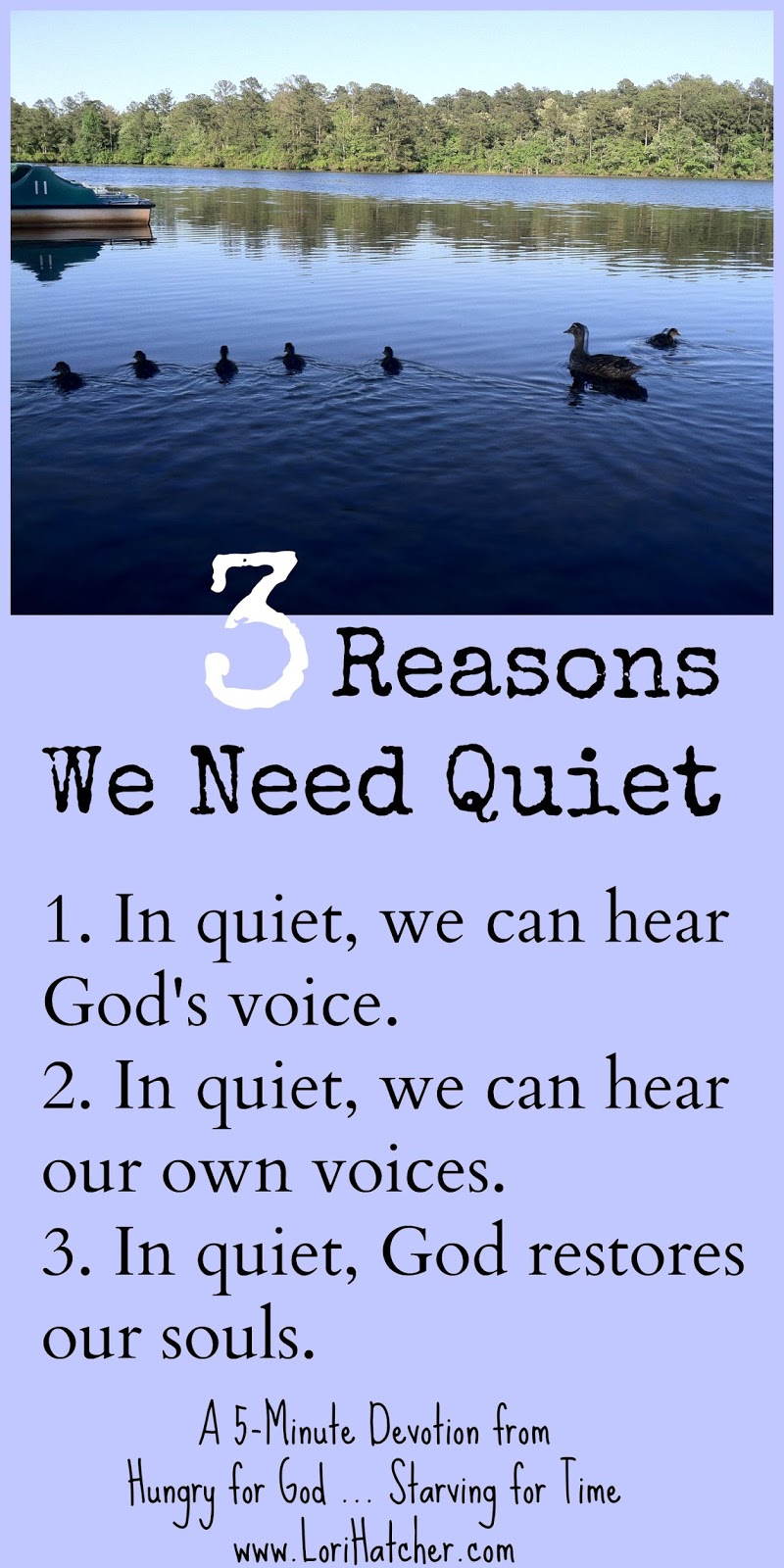 1. Quiet allows us to hear God’s voice. As I study God’s Word, I see times when he thunders from the mountain top or shouts through a storm. Most often, however, he speaks to his children in the still, small voice of the Holy Spirit in our souls.Think of Elijah on the mountaintop and David in the open fields, or Daniel in his prayer closet and Jesus during his early morning worship times. Sometimes he shouts over the din or our lives through an accident, illness, crisis, or family emergency, but often, even then, his voice is muffled by the chaos around us.
