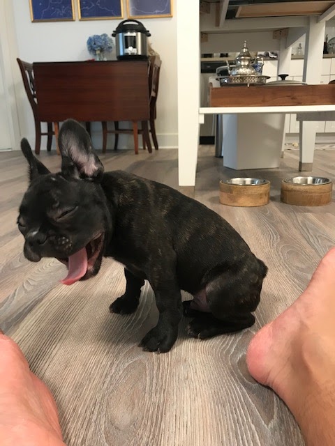 I speculated about the puppy, too. I’d seen pictures of his mother and father. Would he be brindle or solid? Short-legged or longer? Would he have pointed ears or rounded ones? And what about that goofy, tongue-lolling grin so characteristic of a Frenchie?