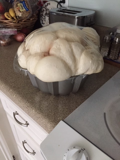 I should have listened to my friend Karen. “Sprinkle the nuts in the bottom of the pan, then arrange 15 frozen bread balls on top.”