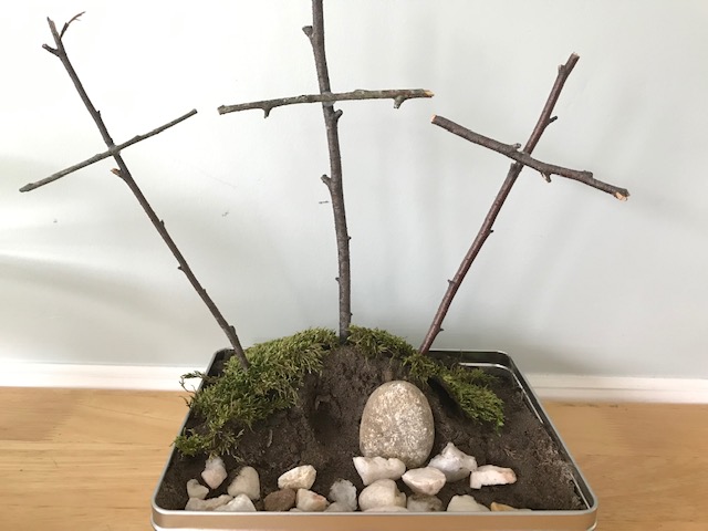 We tucked moss around the crosses and placed a stone beside the opening to the empty tomb.