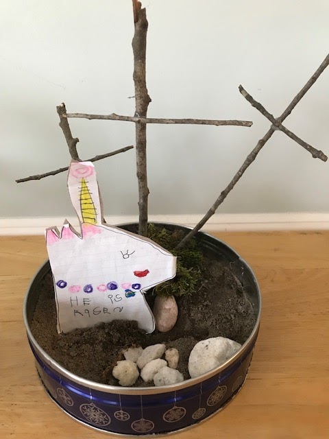 Lauren's 3 Crosses, complete with a unicorn announcementdeclaring, "He Is Risen! :)Finishing the story, I pushed three crosses into the soil. “Whenever we see three crosses, we need to ask ourselves, ‘Am I the prideful man who made fun of Jesus? Or am I the humble man who asked Jesus to forgive him and take him to heaven one day?'”