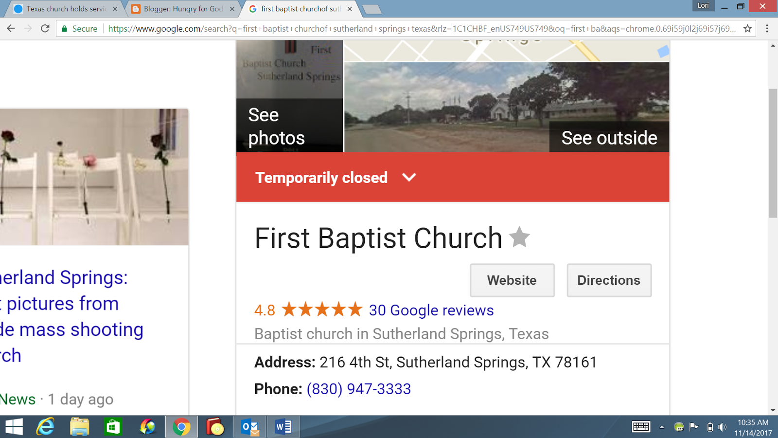A Facebook post from a survivor of another church shooting said what ministered most to her grieving church family were cards from fellow believers telling them they were praying for them. I Googled First Baptist Church Sutherland Texas to find the address and send a card of my own. My search produced this image: