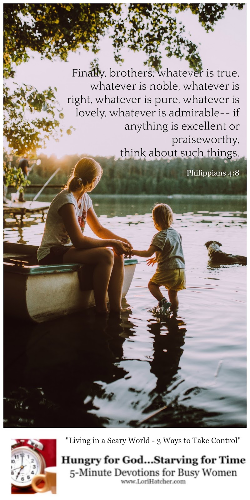 If you, like me and our little Caroline, tend to be frightened by the things you read and hear, why not try a Philippians 4:8 experiment? For one week, filter your news coverage, choose your recreational reading material carefully, and skip the scary movies and television. Choose instead to fill your mind with things that are true, noble, right, pure, lovely, admirable, excellent, and praiseworthy. Read a Christian novel, watch an inspiring movie, or spend some time in God’s Word. At the end of the week, assess your fear level. I’m confident you’ll see a positive change.
