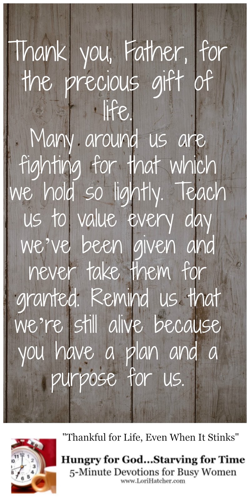 Thank you, Father, for the precious gift of life. Many around us are fighting for that which we hold so lightly. Teach us to value every day we’ve been given and never take them for granted. Remind us that we’re still alive because you have a plan and a purpose for us. Thank you for your grace and mercy. In Jesus’ name I pray, Amen.