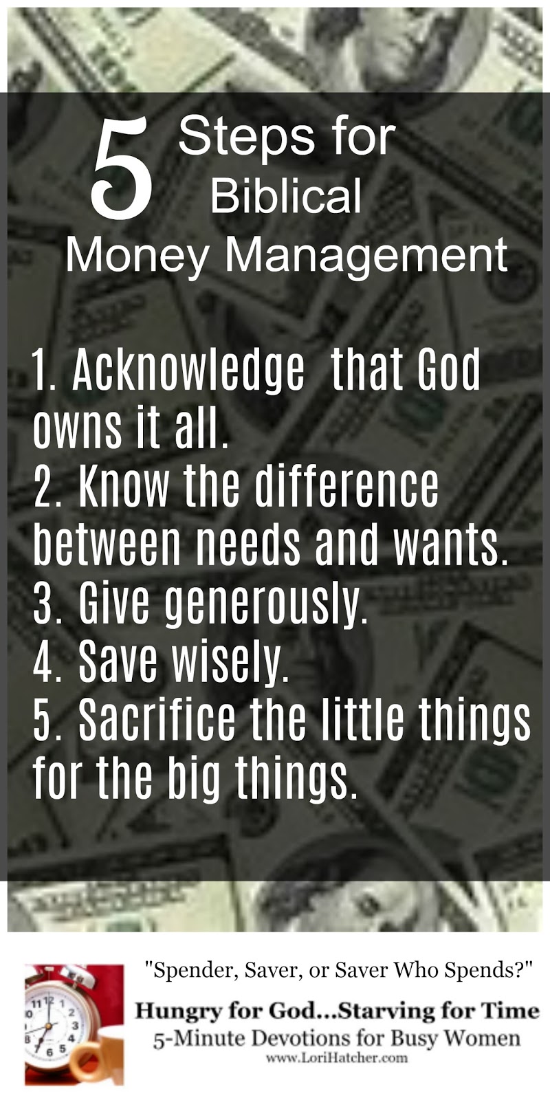 1. Acknowledge that God, not you, owns your money and possessions. We are only stewards. As financial managers, we are to spend and save God’s money according to the principles in his Word. As we do so, he promises to meet our needs, but he may choose not to provide some of our wants if our desires will hinder or harm his greater purposes. 2. Recognize the difference between needs and wants. Cable TV, a late model car, and mani-pedis are not needs. We can sacrifice these luxuries to help us accomplish long term financial goals like becoming debt free, investing in God’s kingdom, or sending children to college.