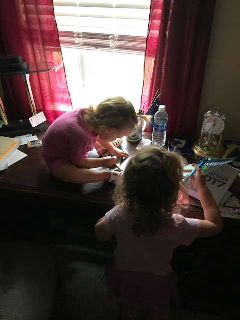 “Here, Caroline, stand on this so you can reach. That way, I can use the chair.” These were not the words I wanted to overhear when I discovered my 3-1/2-year-old granddaughter and her 1-1/2-year old sister playing alone in my office. As I peered around the corner, I had no idea what they were up to.