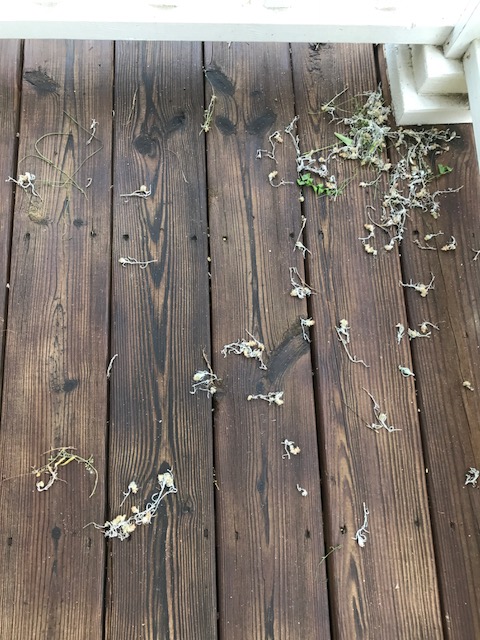 The morning after the first day of construction, I walked out onto the porch to find the nest destroyed. Straw, grass, and fluff lay strewn all over the porch. Over the next few days, the industrious little birds rebuilt their nest bigger and better. But I again found it demolished, only this time, amidst the rubble, I saw two tiny blue eggs—smashed, their yolks making shiny yellow puddles on the wooden floor. I’m not sure if the finches keep destroying their nest or if a predator is attacking them.