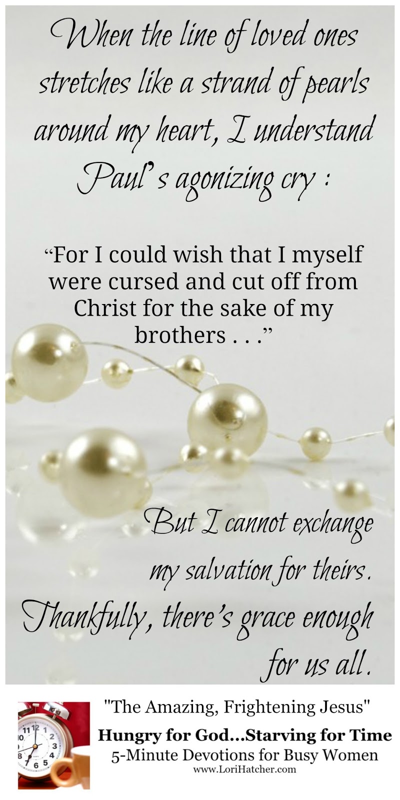When the line of loved ones stretches like a strand of pearls around my heart, I understand Paul’s agonizing cry in Romans 9:3, “For I could wish that I myself were cursed and cut off from Christ for the sake of my brothers . . .” But I cannot exchange my own salvation for theirs. Thankfully, there is saving grace enough for all. Refining grace, too, and so I labor in love and prayer. Lord, make me an instrument, not a stumbling block. Give me wisdom to know when to speak and when to be silent, when to act, and when to pray.