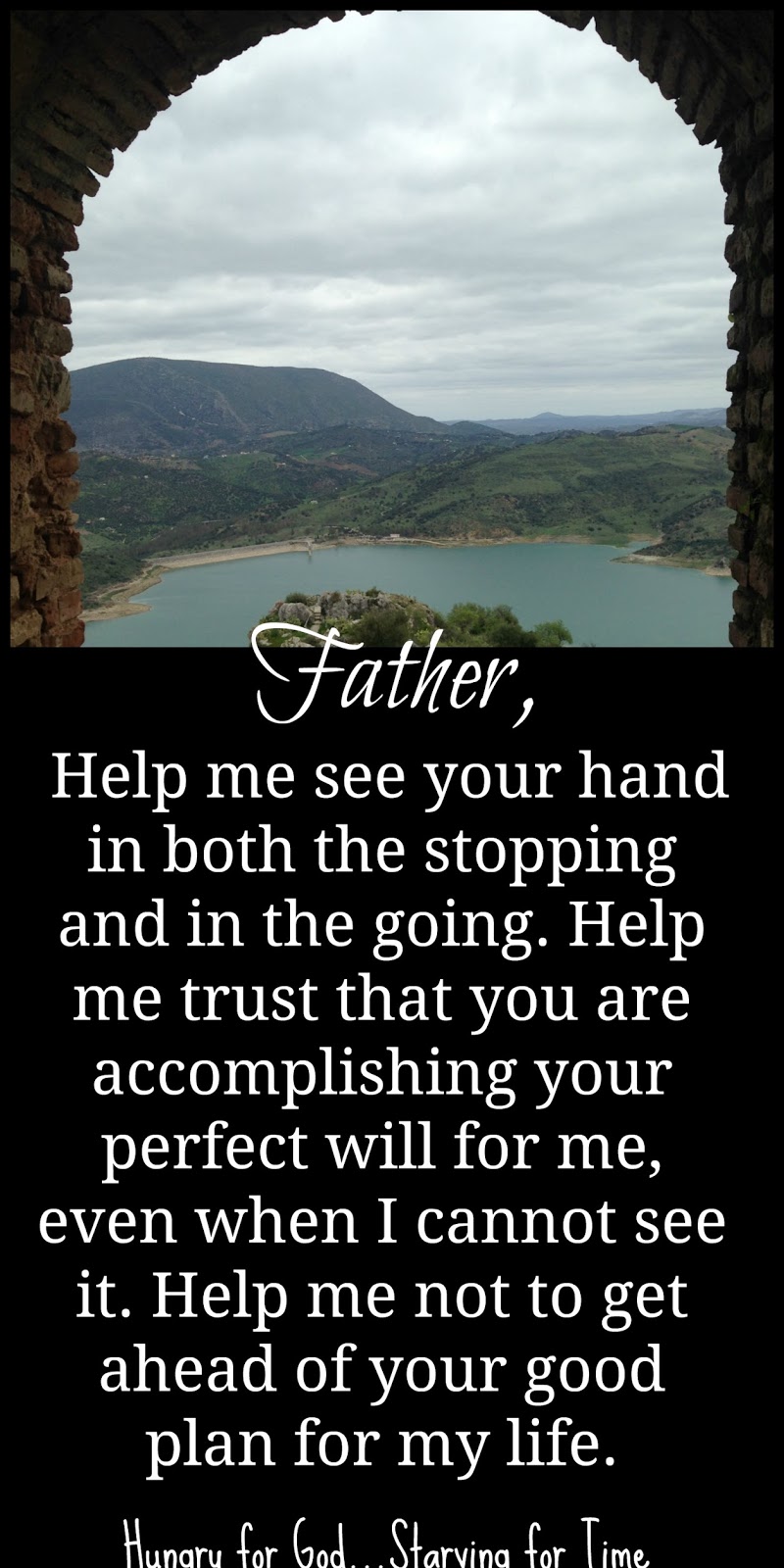 Father, help me see your hand in the stopping and in the going. Help me trust that you are accomplishing your perfect will for me, even when I cannot see it. I know you can use every circumstance to make me more like Jesus. Help me not get ahead of your good plan for my life. In Jesus name I pray, Amen.
