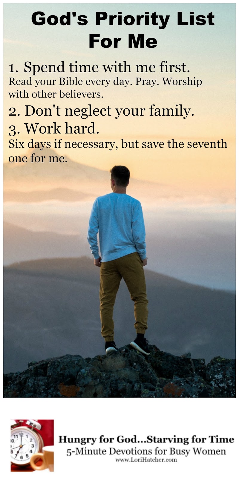 The truth is that God established a priority list we would do well to heed. It reads something like this: 1. Spend time with me first. Read your Bible every day. Pray. Worship with other believers.