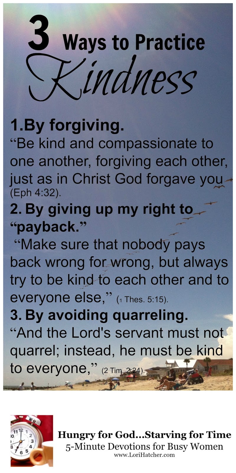 Scripture gives me several ways to practice kindness:1. By being quick to forgive. “Be kind and compassionate to one another, forgiving each other, just as in Christ God forgave you” (Eph. 4:32).