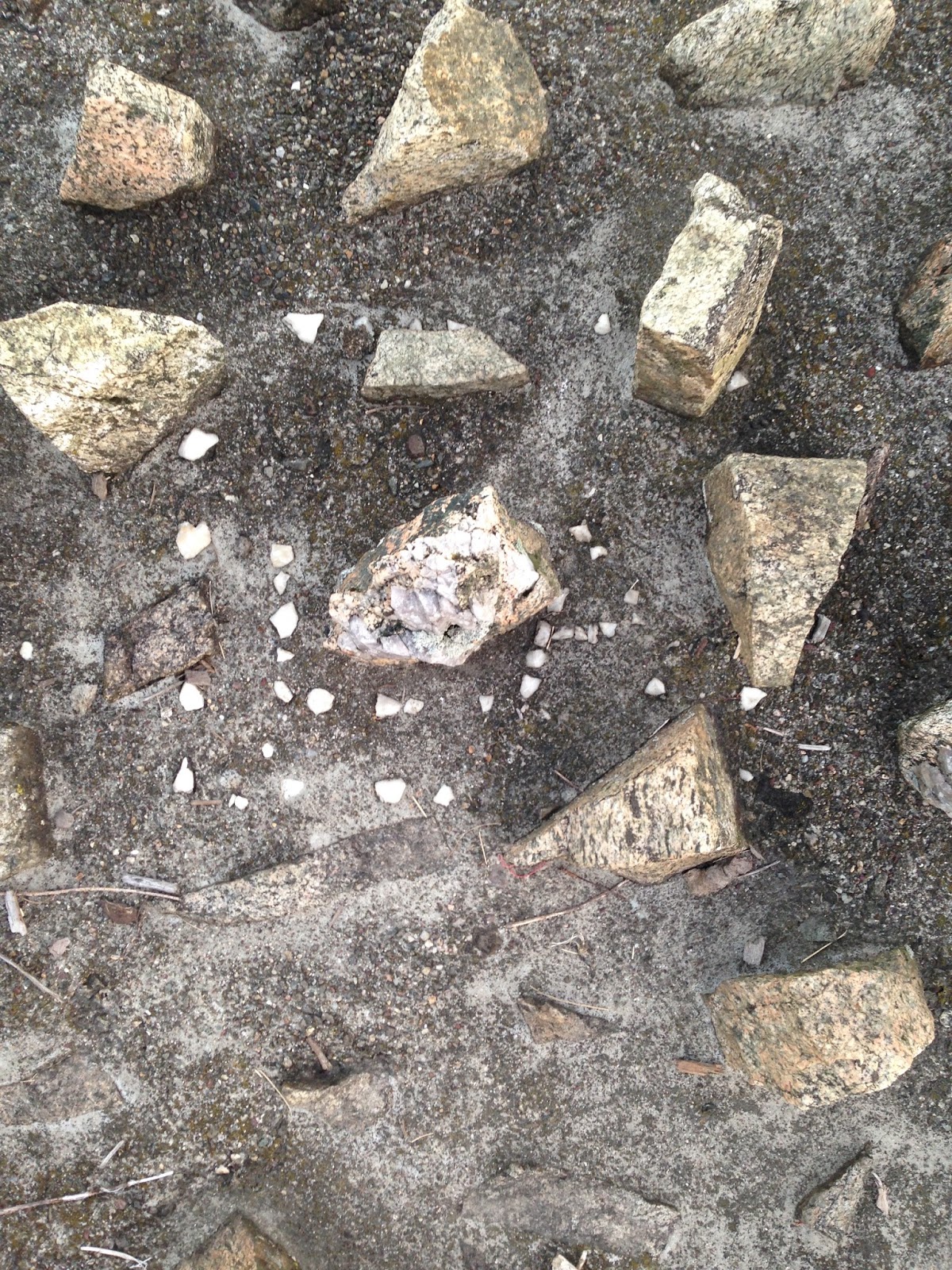 While she looked on curiously, he scooped soft cement from the bucket and ladled it in between the stones on top of the wall. He smoothed the edges, blending them into the surrounding concrete. Then, one by one, he gently placed the little white stones just so. My mom, fascinated by his handiwork, watched her initials form under his careful hand. After he pressed the last stone into its soft setting, he stood back to admire his work.