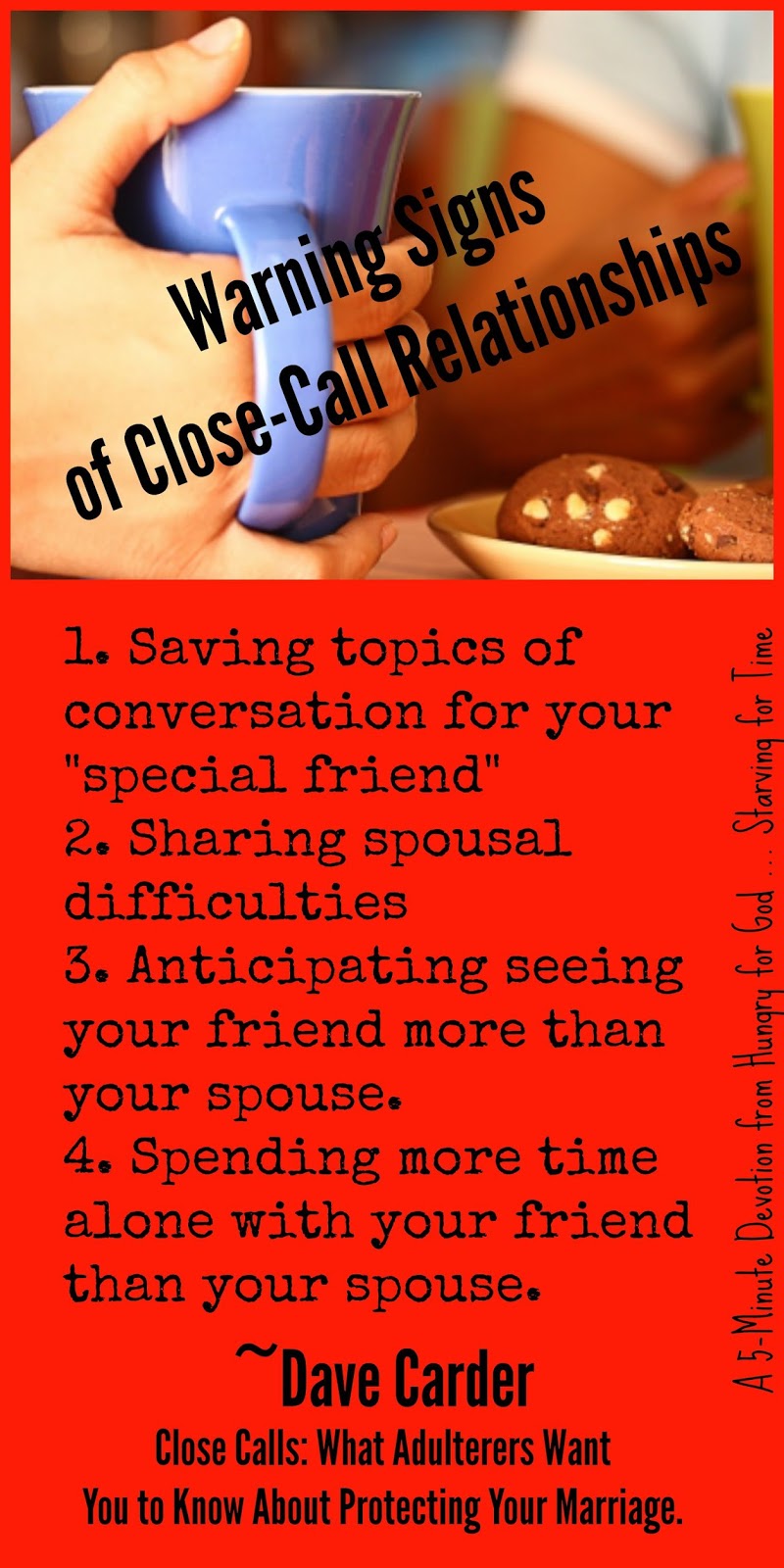 His book contains the list, “19 Danger Signs of Close Call Relationships.” Based on years of counseling research, he’s identified the actions that often precede extra-marital affairs. The list is eye opening and frightening.Even more eye opening is his description of how subtly and innocently most extramarital affairs begin. Because men and women are thrown together so much more in today’s society than they used to be—at work, the gym, and yes, even at church, the possibility for temptation is higher than it’s ever been. It’s not unusual that men and women spend more time together every day with someone other than his or her spouse.
