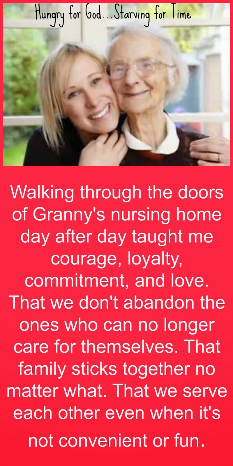Every time I made the long drive to visit her, and care for her, and love her more than I loved myself, and my schedule, and my convenience, I was becoming a better person. More compassionate, more appreciative, more gentle, more unselfish, more humble. Dying to my flesh that sometimes wanted to be anywhere but walking through the doors of that nursing home taught me courage, loyalty, commitment, and love. It taught me that we don't abandon the ones who can no longer care for themselves. That family sticks together no matter what. That we serve each other even when it's not convenient or fun.