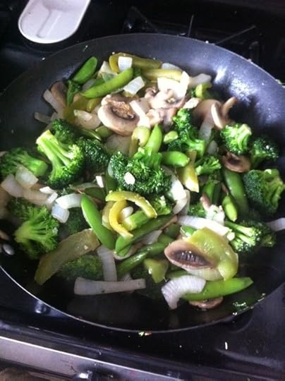 Pictured here are garlic, onion, green peppers, button mushrooms, sugar snap peas, green beans, and broccoli. Not pictured: cubed red potatoes roasting in the oven with olive oil and garlic.