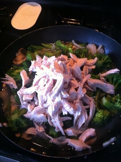 To that I added some chicken poached in chicken stock with garlic (again! you can never have too much garlic!). I like to poach chicken because it’s pretty fool proof for getting tender meat. I just bring the liquid (stock or water) to a boil with a chicken breast or two already in it and then remove from heat, cover, and let sit for 30 minutes. Hard to screw up, right? Moist and pulls apart easily with a fork.