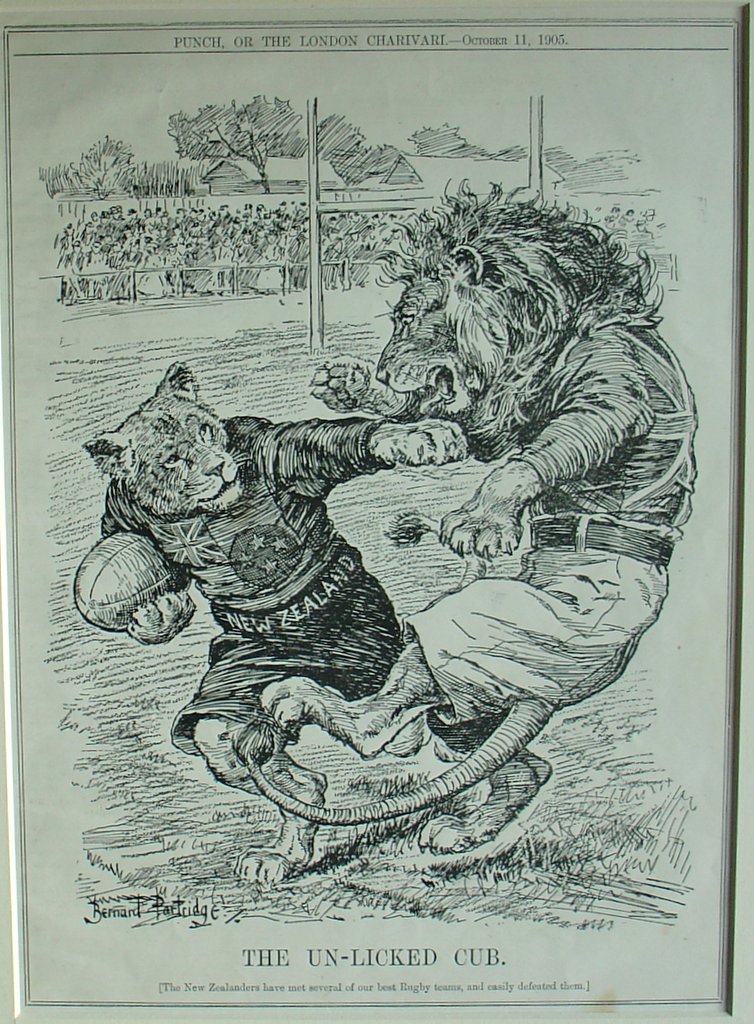 Punch cartoon 1905 - the unlicked cub 1905 saw the first true international New Zealand touring side set out for a grand tour of Europe and North America. Known simply as 'The Originals' their exploits have become the stuff of legend. It was this team who were the first to play in all black strip and so were quickly dubbed the 'All Blacks' by the British press. Arriving in Plymouth in September 1905 the New Zealanders first faced the Devon county side whom they swept aside in a 12 try demolition to win 55-4. Some of the stunned newspapers reported the score-line the wrong way around. The New Zealanders followed up with an 11 try 41-0 drubbing of Cornwall and then continued in the same vein as they toured the country, dishing out humiliation wherever they went. By the time they reached Scotland for their first international in mid November they had won 19 straight matches. 15 of these had been won without conceding a point. In Edinburgh they received a snooty reception from the gentlemen of the Scottish RFU who refused to socialise with the colonials. Un-phased, the All Blacks beat the Scots 12-7. The superior professionalism of the New Zealanders; a dirty word amongst many in the British establishment, was the key to their success. They trained hard and they practiced their set piece drills. Unlike the British opposition, who simply piled in to the scrum in the order they arrived, each forward had a set position in the scrum. They scrummaged differently to the British teams who adopted the 8 man formation we are familiar with today. The All Blacks played with just 7 men in the scrum and only 2 players in the front row. This mismatch actually worked to the New Zealanders' advantage since by applying pressure to only one side of the scrum they were generally able to drive their opponents off the ball and this was an area in which they dominated. As well as being more organised, the All Blacks played with more attacking verve. The sight of the New Zealand full back actually counter-attacking rather than playing an entirely defensive role was considered highly novel. There was also much grumbling that the All Blacks played a little too rough, although there was less complaint amongst the workmanlike northern clubs than amongst the more genteel southern clubs.