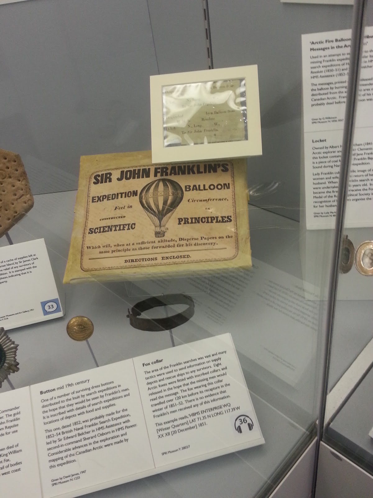 A balloon, button and fox collar from the Franklin search in the Polar Museum Cambridge - my pic.