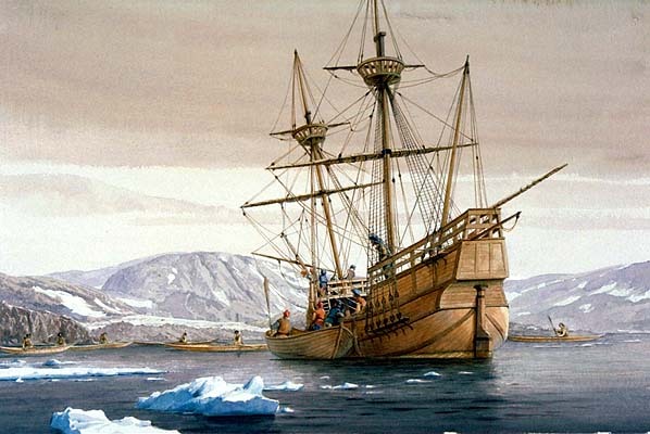 John Davis (left) holding his quadrant Davis, Frobisher and other stout hearted Englishmen were far too busy the following year giving a bloody nose to the Spanish Armada to worry about the northwest passage and it would be some thirty years before interest in the frozen north was rekindled. By this time James I was on the throne and the most accomplished explorer of the age was Henry Hudson. Hudson had been employed by the Dutch East India company in unsuccessfully trying to find a northeast passage around the northern coast of Russia and in probing the eastern coastline of North America, where he explored the river that now bears his name. In 1610 Hudson was somewhat forcibly persuaded to switch his allegiance to the English Muscovy Company and set out aboard the Discovery in search of the north-west passage. It would prove an ill fated voyage. Finding his way through the strait identified by Davis and into the large bay later named in his honour, Hudson began exploring and charting the coastline in search of a possible route westwards. As winter set in, the Discovery became trapped in the bay by the ice and Hudson and his crew became the first to overwinter in the Arctic. The ship was beached and the crew survived through the winter but when summer came around and Hudson declared his intention to continue searching for the passage he faced mutiny from a crew determined to return home rather than face further hardship. Hudson either was murdered in cold blood or set adrift in a small boat along with his son and a number of other loyal crew members as the mutineers maintained. None of them was ever seen again. The ship returned home with just eight crew, all of whom faced murder charges but all were acquitted and two even later returned to Hudson's bay on the Discovery in 1612, so common sense rather than cowardice must have been the motivation for their actions against Hudson as the court accepted. On its next mission Discovery explored much of the remainder of the bay and overwintered again. The accompanying ship Resolution was crushed in the ice and the scurvy-riddled survivors returned on the Discovery to announce that the bay contained no route to the west.