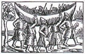 Rus traders resorting to portage - Olaus Magnus The first permanent Viking presence in what is now Russia was established in the form of fortified settlements along the shores of Lake Ladoga during the mid Eighth Century. Setting out from their Swedish homeland, the first colonists came both as warriors and as traders, as the presence of both a sword and a set of scales as grave goods for the same individual testifies. They had the capacity to fight for land or plunder and to defend and keep it and to take slaves in large numbers from the native population to be sold down the river. They could however, also offer protection to the native population and they set out to put down roots and establish peaceful and profitable trade. Indeed, so welcome did the Viking presence become that in the end a legend was born that the natives, tired by ceaseless infighting, had actually invited them to come and rule over them. Such is the tale of Rurik, eldest of three Viking brothers who is credited with establishing his rule in the town of Gorodisce, known as Holmgard in the Icelandic sagas, on Lake Ilmen, near the headwaters of the Volga.