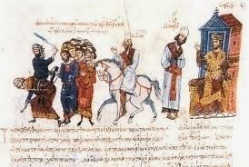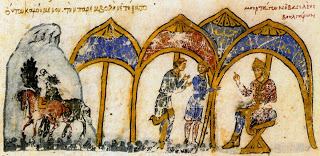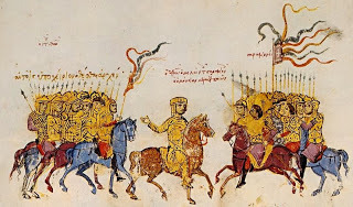 Thomas the Slav in Syria - Madrid Skylitzes In 821 Thomas marched into Syria at the head of his considerable forces in a show of strength calculated to impress. Here too, the chameleon-like Thomas presented himself to best effect to gain the friendship of the Caliph Al-Mamun. His emissary to the Caliph was sent with extravagant promises to make. Allowing for propaganda intended to blacken his name as a traitor to the empire, Thomas is variously credited with signing away frontier provinces or perhaps even undertaking to en-fief the entire empire to the Caliphate in exchange for an alliance which would safeguard his rear whilst he turned his forces against Constantinople. The Caliph accepted with alacrity and provided Thomas with a substantial contribution to his war chest. The rebel was even permitted to celebrate his coronation as Emperor of the Romans in the city of Antioch. Al Ma’mun would have been advised to remain sceptical of the bargain. Thomas, after all, was not the first Byzantine rebel commander to promise much and deliver nothing. Leo III had struck a similar bargain a century before. At any rate Thomas’ friendly overtures were well timed for the Caliph had his hands full already with the rebellion of Barbak. More on Babak's revolt hereWith peace secured and having defeated a loyalist army from the Armeniakon Theme, Thomas turned his vast polyglot army which may have been as large as 80,000 men, against Constantinople. The fleets stationed along the eastern shore of the Marmara also declared for Thomas and so he was able to ferry his troops across the straits and lay siege to the land walls at Blacharnae. The defences here proved too strong for the attackers however and the massive catapults stationed on the towers wrecked destruction on every engine of war that Thomas was able to send against them. Just as it had seemed that the resolve of the defenders was weakening and the emperor Michael had appeared upon the walls in person to deliver a heartfelt plea for peace to the besiegers, lulling them into a false sense of security, a sortie launched from the gates fell upon the disorganised rebels and inflicted much slaughter upon them. At sea too Thomas’ forces were bested by the loyalist fleet and many of his ships were destroyed by Greek Fire. The siege dragged on through 822 and the besiegers endured a second miserable winter outside the walls before in the following spring came the fatal blow. From out of the west, falling like a hammer blow upon the rebel’s rear, came the army of Ormortag, son of Krum, who had been unable to resist the lure of easy plunder and come to Michael’s assistance. The Bulgar attack shattered Thomas’ army which withdrew westwards with the emperor’s forces hot on their trail; Michael himself at their head.