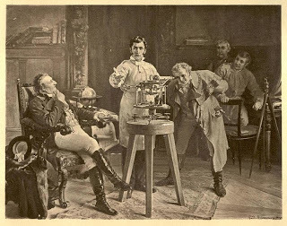 Joseph von Fraunhofer demonstrates the spectroscope Combining the spectroscope with a telescope allowed the emission spectra; that is the emission of light by hot gasses at specific wavelengths corresponding to their chemical composition, of various celestial bodies to be studied. In 1865 English astronomer William Huggins, working alongside his wife Margaret, used this method to study the Orion nebula and declared it to be composed of ‘luminous gas'. Huggins was puzzled by the emission spectra that he obtained from his studies of nebulae as some of the emission lines did not correspond to any known element. He therefore proposed the existence of an entirely new one – Nebulium. Sadly it was later shown that the mysterious spectra corresponded to doubly ionised oxygen and that nebulas are not made of nebulium. Sometimes the truth can be so disappointing. In the course of his studies Huggins also observed the phenomenon of ‘doppler shift’ in the spectral lines of celestial bodies either towards the red or blue end of the spectrum depending on whether they were moving closer to or further away from the earth, which would later be seized upon as evidence of the fact that the universe was expanding.