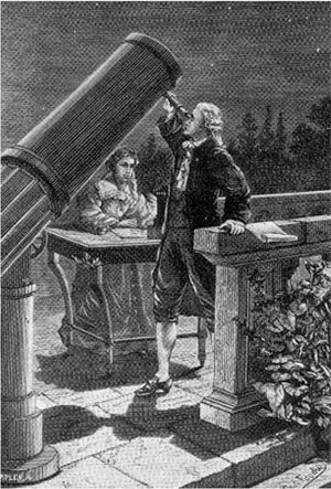 The advent of the 'Newtonian' reflector telescope brought better views of Mars than ever before. In the early 1780's William Herschel turned his attention to Mars with a 20 foot long reflector and observed with interest the changing nature of the poles. Herschel proposed that the growth and shrinkage of the polar caps was seasonal. He also demonstrated that Mars had very little atmosphere by observing that there was no discernible dimming of stars immediately before they passed into the shadow of the red planet. It was in the course of such observations in 1881 that Herschel made his most famous discovery; the planet Uranus. The moment of discovery is immortalised in this contemporary engraving (left) showing William and Caroline Herschel at work.