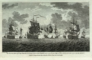 Let us resume the journey through British naval history through the admittedly somewhat haphazard means of focusing on ships by the name of Dreadnought. We find ourselves now in the first year of the Seven Years War. Even as one Dreadnought was gently rotting away another was already in service. Launched in 1742 this 60 gun incarnation would spend much of its time in the West Indies. In 1757 with hostilities resumed with France, Dreadnought found herself under the command of Captain Maurice Suckling, uncle of Horatio Nelson. On 21st October 1757 Dreadnoughtwas cruising off of Cap-Francois in the French colony of St Domingue on present day Haiti in company with two other ships of the line; the 64 gun Edinburgh and the 60 gun Augusta, flag ship of Commodore Arthur Forrest. The English ships were hunting a French convoy which they duly encountered, escorted by four ships of the line and three frigates.
