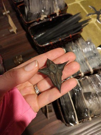The ninja sword was shorter than a samurai sword and straight, not curved, for stabbing in an enclosed spaces where a longer Samurai sword would be unwieldy. I had the impression that a ninja versus a samurai in a straight sword fight would not end well for the ninja. However, the ninja had so many other weapons in their arsenal, like the shuriken above, which evens things up considerably.