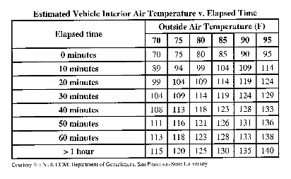 Quite a few people travel with their pets when the days are warm, even running errands with their pets “riding shotgun.” Unfortunately, unless you plan on leaving the engine running and the air conditioning on full blast, leaving your dog in the car while you run into that store for a “few seconds” is simply NOT an option. Whether or not you leave the windows down or up, park in the shade or not, it doesn’t matter. Here’s a chart demonstrating how hot the inside of the car can get at various outdoor temperatures.