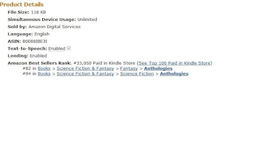 Granted, my novella, "A Fairy for Bin Laden,", is ranked only at about 33,000 of the one-million literary offerings on Amazon, but still, I'll allow myself a hit of vanity for hitting #82 in Books > Science Fiction and Fantasy > Science Fiction > Anthologies and #94 in > Science Fiction and Fantasy > Fantasy > Anthologies.