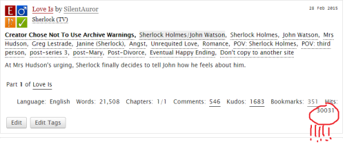 Heyyy, look at this!! I’ve been sleeping on the job or something and didn’t notice that my story Love Is passed the 30,000 hits mark! I was aware that it was getting close, but it must have crossed that line a day or two ago! This makes my 17th fic out of my current 87 to have attained this milestone! This is a post-series 3 story that deals hard in the theme of unrequited love. John’s head is *quite* firmly lodged up his posterior in this one, but he has a real come-to-Jesus moment (which the companion story, The Things That Matter) shows in depth and it all works out in the end. The basic concept is: Sherlock initiates the conversation about their friendship becoming something more and John turns him down. The angst level of this nearly gave me an ulcer. Enjoy, lol! If you’re responsible for any one of those 30,000 hits on this story, thank you!!! If you liked it, thank you even more, haha!