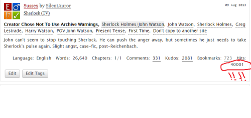 Oh, wow! It’s a day for feeling absolutely humbled by how many of you out there read my stories. Seriously - between the love you’ve been heaping on my newest (Sine Nomine) and now this milestone, I’m just drowning in the best of ways over here! Sussex is my first (serious) John POV fic, written way back in August, 2013, and is now the 7th of my 87 posted fics to have attained 40,000 hits! Thank you to every last one of you who have read this one!