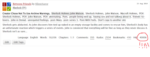 Whoa!!! I just spotted that my story Between Friends just reached 40,000 hits!!!! This is only the 10th of my 90 current fics to have made it to this massive milestone! This is the story I wrote after the saddest story I’ve ever written (The Final Proof) and was intended to be just a light piece of smut, but then went and got all angsty on me, lol. It all works out in the end, though! Thanks to anyone and everyone who gave it one of those 40,000 hits, even more so if you liked it! :)))))