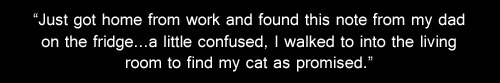 Let us just appreciate that this person’s dad didn’t know when they would be home and so he couldn’t plan for them to be able to join the family for dinner, but he knew with no doubts that dear sweet Meatloaf staying in that exact position for hours was an absolute in this scenario. Truly, that cat was named well.