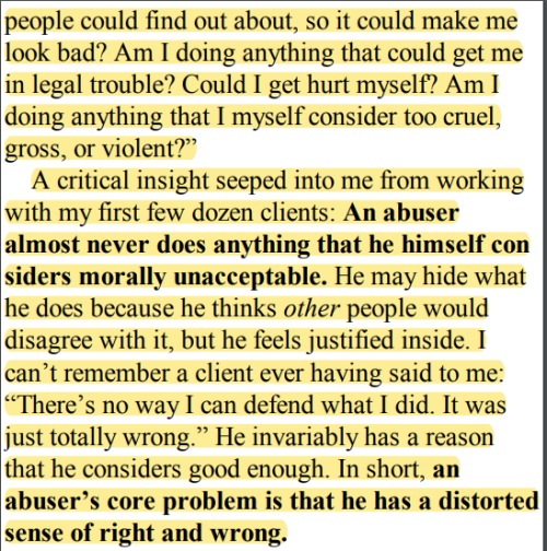 “Don’t say that. Don’t ever say that. He is responsible for his behavior. If he truly couldn’t control his behavior, he would need to be institutionalized, but that’s not what’s happening. Institutionalization isn’t what he needs. He needs to be held accountable for the acts he thinks his anger makes excusable. He’s not out of control, he’s not exercising his control appropriately - saying that he’s out of control lets him off the hook and teaches him the wrong thing”