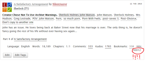 Ahhh, omg!! My fic A Satisfactory Arrangement just reached 30,000 hits today!!! This is so cool! This story was meant to take the friends-to-lovers thing and change it around to sexual partners-to-lovers, just for a little challenge. In this (post-series 3/post-Mary) story, John doesn’t want to leave Sherlock or Baker Street again, but he also doesn’t never want to have sex again and knows that Sherlock would worry if he ever dated someone new. So he proposes what seems like a somewhat obvious solution to him… :P