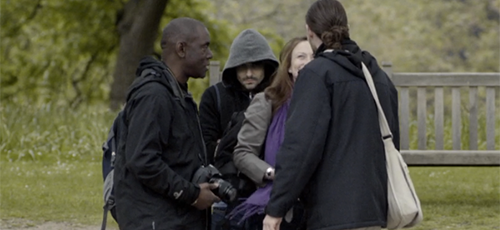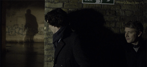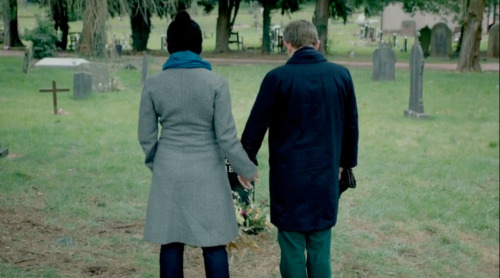 Finally, it’s no mistake she is wearing a long, grey coat which flares slightly from the waist, and a blue scarf. But they are paler shades of those colours than Sherlock’s coat and scarf were, because Mary is but a pale imitation of the person we are used to seeing standing beside John Watson (even once, when they were handcuffed together, holding John Watson’s hand in a manner similar to what we see here). Her coat and scarf look cheap, “less than,” and her denim jeans are “less” than Sherlock Holmes’s designer trousers. Her dark hat is a visual echo of Sherlock’s dark hair. This whole shot is set up not only to remind us that Sherlock used to stand here at John Watson’s side, but also that This is some lesser, fake, replacement-Sherlock standing at John Watson’s side, and whether consciously or unconsciously, John has chosen a pale imitation indeed.