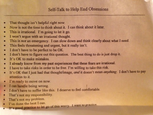 While cleaning out my room I found a paper that my therapist gave me some time ago to deal with obsessive and intrusive thoughts. Sorry the paper is a little crinkled and stained, but I figured I’d post it in hopes that it will help someone like it helped me.
