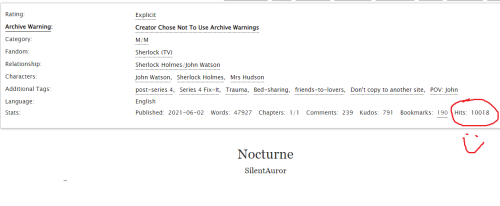 Heyyy, my second most recent story, Nocturne, just achieved its first 10,000 hits milestone today!! That’s so nice! This is a quiet story that deals with trauma resurfacing, a bit of hurt/comfort, and a lot of it takes place at night, hence its title. It’s the 64th of my 90 currently-posted fics to hit this mark, and it’s always super exciting! Thanks to all of you who have taken the time to read it! Extra thanks if you even liked it, haha! :)))