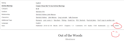 Heyyyy, my fic Out of the Woods just reached 20,000 hits as of today! That’s so great! This is the 35th of my current 95 posted stories to have hit this milestone, and that’s so exciting! Thanks to any of you who have read it and liked it! <3333333333333333