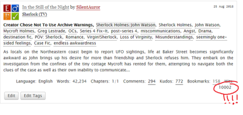 Hey, look at this!! My fic In the Still of the Night just reached 10,000 hits! :))) This one is about Sherlock and John having just started to navigate life post-series 4 when John makes an untimely declaration of his feelings. Sherlock, feeling that their friendship is already on very tenuous footing, turns him down. Right after that, Mycroft sends them off to the northeast coast of England to investigate local UFO sightings, while sharing a tiny cottage. It’s awkward. Lol. Insert many more awkward late-night conversations, terrorists, and a lot of very rural setting, and voilà! Thanks to everyone who’s read this one, especially if you liked it, haha! :) This is my 56th fic (out of the 84 I currently have in this fandom) to reach 10,000 hits and it’s always super exciting. Thank you so much!!