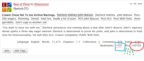 Soooo…. way back in 2014, series 3 of Sherlock aired. I went slightly mad and immediately wrote three long, plotty, dense fix-it fics (Deductions of a Lesser Mind, Act IV, and Vena Cava). And then I was tired, and I decided to write something light and silly, allllmost crack. To my immediate irritation, that story instantly became the most popular one in my collection, by a WIDE WIDE margin. It has, despite having written literally over 2 million words more fic since then, retained that title. Best of Three just set a new hit count record in my own collection (and I only compete my fics with each other, never with other authors’!), reaching 140,000 hits sometime quite recently (did one of you lovely souls rec it recently or something??), with a staggering 6,245 kudos, and 1,800 public bookmarks (2,625 counting private ones). I have a little tradition of celebrating my fics’ progress with every new 10,000 hits reached, meaning that Best of Three has now had fourteen of these posts where I talk about how it came about and what new record it’s achieved this time. Fourteen!!! That’s so crazy! My irritation with this story’s popularity (ha!) faded years and years ago. Now I’m just delighted that so many of you apparently like it so much and that it’s still being read, re-read, and newly discovered eight years since its posting, way back in February 2014. That’s such a gift, so thank you for reading this one and for all the love you folks have heaped on it over the years! May John’s “sympathy erections” continue to make you chuckle for many more years to come!