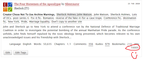 Hey, look at this late Christmas/early birthday present the universe (aka: you lovely people!) has given me! My story The Four Horsemen of the Apocalypse just reached its first 10,000 hits! That’s so very cool!