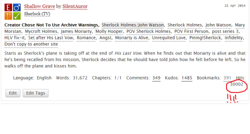 Omg, wow, yay! My story Shallow Grave just passed 30,000 hits today! This is one of the many series 3 fix-its I wrote, one of the few in which I wrote Moriarty as still living (I never believed it could possibly be real, so normally I wrote something along the lines of Mycroft having invented it to get Sherlock out of his death sentence mission in Serbia). It’s also one of my first person Sherlock POVs, and those somehow always feel a bit closer to the heart for me. This is the 19th of my 88 currently-posted Sherlock fics to have reached 30,000 hits, which is mind-blowing! Thank you to all of you who have read it, left comments or kudos or bookmarks on it, or even gone back and read it again! Day: made! :)))