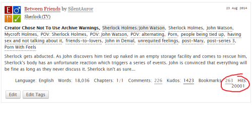 Whoo, my story Between Friends just surpassed 20,000 hits! I initially wrote this story as a semi-apology for having written a story in which Sherlock dies (of old age!) and made 99% of the people who read it bawl, apparently. I meant to write something light-hearted and porny, but apparently I’m not good at leaving plot out and it became a bit more angsty and emotional than I’d originally intended! Either way, thanks for reading this one and giving it love! Between Friends has become the 14th of my 62 stories to exceed 20K hits and that’s really exciting. Thank you!!!!