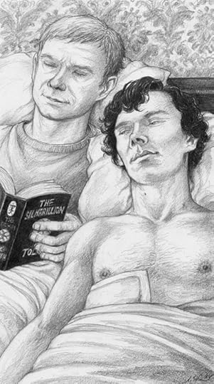 Today is Tolkien Reading Day, so it can’t have been coincidence that on this very day I came across the beautiful fanfic Vena Cava by SilentAuror which inspired the drawing above: John reading the Silmarillion to Sherlock as he’s recovering from his gunshot wound. I look forward to reading more from this author :).