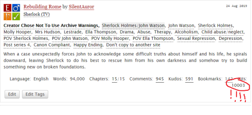 Oh goodness! This belated Christmas gift to me is that my difficult, painful, thorny story Rebuilding Rome reached its first 10,000 hits as of today! This is the 60th of my current 88 posted fics to have achieved this milestone and whenever a story does that (or any future 10k hit milestones), I just like to take the chance to say thank you!