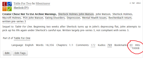 My story Table For Two just reached 10,000 hits!! Thanks, you guys!!! This is the sequel to a story (Table For One) that I originally wrote to a specific request involving John having an eating disorder and serious emotional instability issues. I wrote that one in the midst of the four months it took me to write Against the Rest of the World (specifically between chapters 13 and 14, if you want to know!), and since that one is all in first person voice with Sherlock, I had that rhythm in my head and couldn’t turn it off. I wrote both of those before series 3 aired, when the main genre of the Johnlock fandom was Reichenbach Return fics. By the time I wrote this sequel, series 3 had already aired and I knew that my story was out of sync with then-known canon, but I still felt it needed a sequel, and wrote this one. I actually vastly prefer the sequel to the original, which is so misery-laden. This one is all about Sherlock trying to learn how to care for someone, fully aware that he was behind the hurt which put John into this condition in the first place and now awkwardly trying his damnedest to remedy it, despite John’s prickly pride and stumbling recovery process. Mental illness + new relationship is shaky ground at best, and this was an attempt to begin navigating those waters for them in this particular situation/universe.