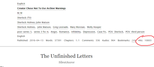 Oh yay! My fic The Unfinished Letters crossed 10,000 hits today! :) This is the 34th of my 62 stories (in this fandom) to have crossed this first big milestone and that’s so exciting!! This one is one of those ones that really crawled into my heart while I was writing it. Sherlock’s despair and yearning kind of killed me a bit to write. Thank you for reading it and giving it love!